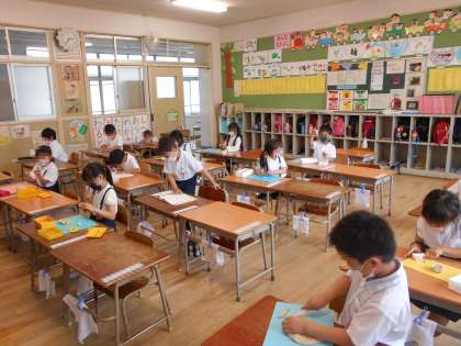 今日は、初めて赤旗が立っているのを見ました。「あの旗は何?」と不思議に思ったようです。雨のため、休み時間に外に出ることができないのが残念でしたが、教室で楽しく粘土遊びやお絵かき、読書を楽しんでいました。