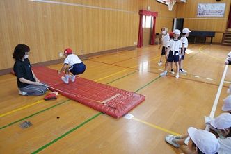 講堂では、立ち幅跳びをしました。立ち幅跳びの仕方を説明し、みんなで「いち、に、さん!」と跳ぶ練習をしました。一通りやってみると、「よし、とべた!」「おもしろいな。」と、立ち幅跳びの運動を楽しんでいました。