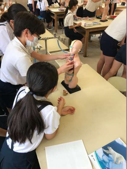 小さな人体模型を使って学習していました。
