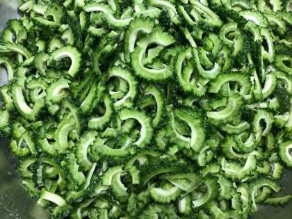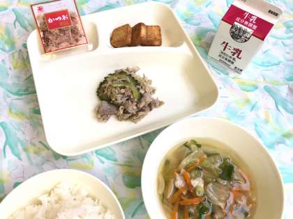 今日は、ゴーヤチャンプルーです。食材のゴーヤは、南大江小学校でも育てています。どこにあるか探してみてくださいね。