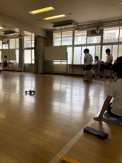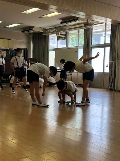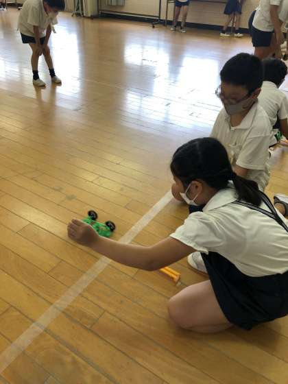 理科の「ゴムのはたらき」の学習で、実験をしました。車についているゴムを伸ばす長さによって、車が進む距離が変わるのかという実験です。ペアの人と予想したり協力したりしながら、真剣に実験をしていました。