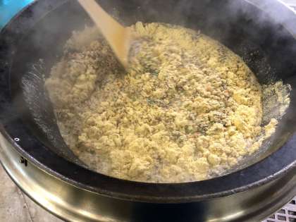 調理員さんが、大きな釜で調理(いり煮に)している様子です。
