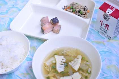 高野どうふのいり煮は、高野どうふを粉にした「粉どうふ」というものを使用しています。だしがよく染みて、大変おいしいです。(こどもは苦手かもしれませんが。)
