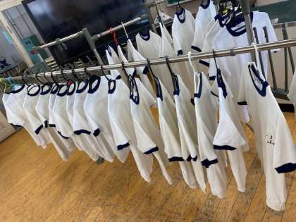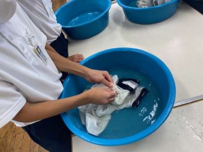 6年家庭科で、「洗たくをしてみよう」の学習をしました。洗たくの仕方を調べて、汚れた体操服をていねいに、「もみ洗い」や「つまみ洗い」をしながら、真っ白になるまで洗いあげました。