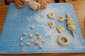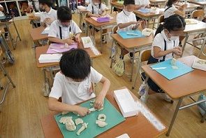1学期の学習で、粘土を丸めたり、紐のように伸ばしたり、平べったくしたりという技法は学んでいます。今回はそれらを応用して、自分の好きな食べ物を作り上げました。