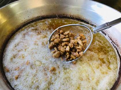 たくさんの豚肉に1つ1つ衣を付け、フライヤーでたくさんの数を揚げていきます。