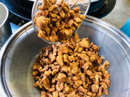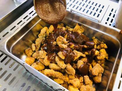 揚がった後は、濃厚なみそだれをかけできあがりです。