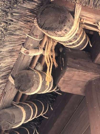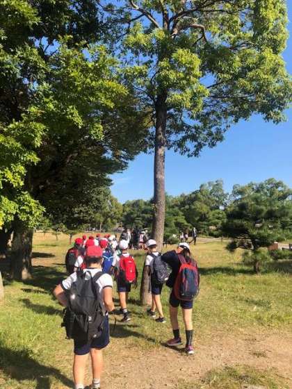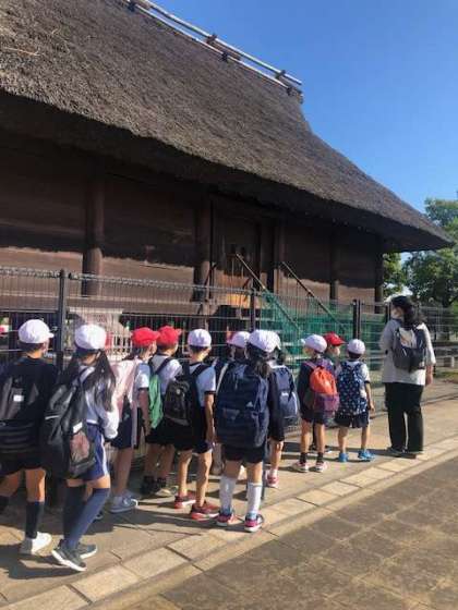 もうすでに、色々な発見をしている子ども達です。高床式倉庫の軒下に、すずめの巣を見つけました!「胸のところが白くてふわふわでかわいいね」公園でトイレ休憩している時も、「あ!飛行機!」と、青空に飛行機も見つけました。桜の木をみて、「枝がコッペパンみたいー!」などなど、想像力も豊かです!