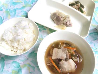 本日の献立「ソーキ汁」は、ソーキ(ぶたのあばら肉)をこんぶやだいこんなどと煮込んだ汁もので沖縄県の郷土料理です。