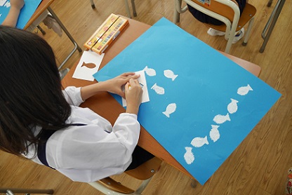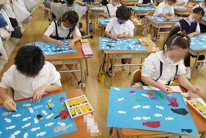 図画工作科で「さかなとあそぼう」をしました。いつもは白色の画用紙に絵を描きますが、今回は青色の画用紙を使いました。この作品では、「魚の型ぬりこみ」にしています。