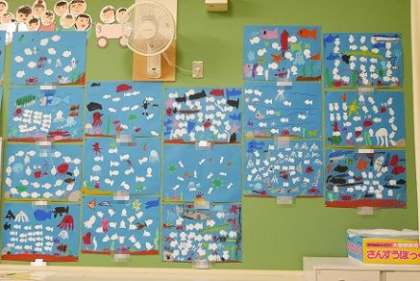 魚の形にくりぬいた画用紙を青色の画用紙の上に置き、魚の形の中に白のパスで塗り込みます。塗り込んだ後、ゆっくり魚の画用紙をのけると、真っ白な魚の絵が浮かびます。それを見た子どもたちから「おぉ、すごい!」「うわぁ、かわいいなぁ。」と喜んでいました。魚の数や魚の向きは、自分たちで考えて描いています。