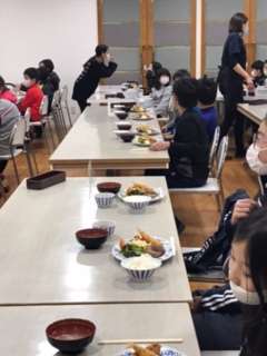 学校と同じように、みんな横並びで食べます。