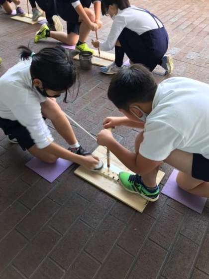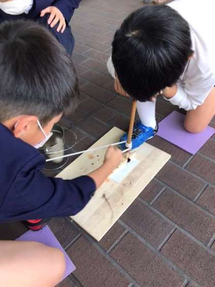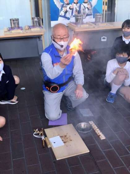 先生の指導の元、「ひもきり式火起こし」体験をしました。先生は着火まで行いましたが、子どもたちは、種火を起こすところまでしました。
