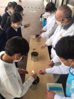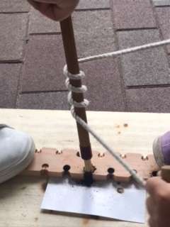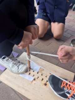 その後は火おこしです。棒を押さえるのが結構大変。ヒモを押したり引っ張ったりも必死です。やっと火種ができた時には座り込んでしまうペアもありました。