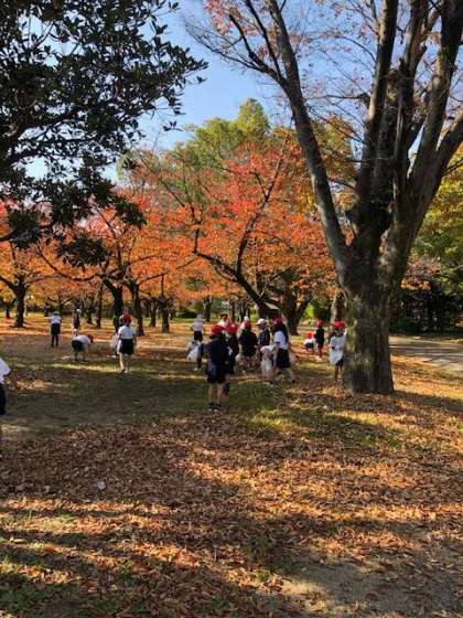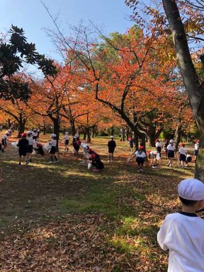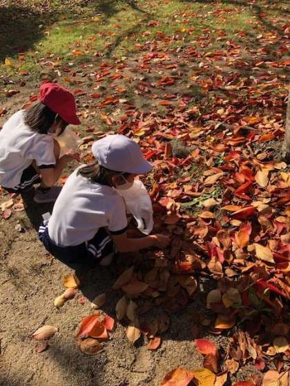 赤や黄色やオレンジの葉っぱがたくさん落ちています。よく見て、特にきれいなものを拾っています!どんぐりもたくさん落ちていて、みんな大喜びです!