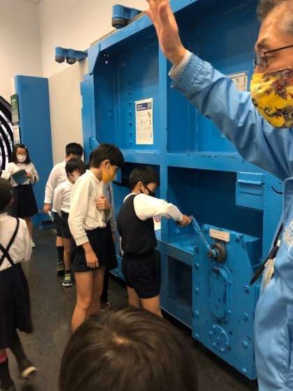 過去に大阪で起きた台風被害についても、たくさんの写真を見ながら学ぶことができました。その中で、防潮水門の大切な役割について知りました。以前実際に使われていた水門で、門を閉めるためのハンドルを回す体験もできました。