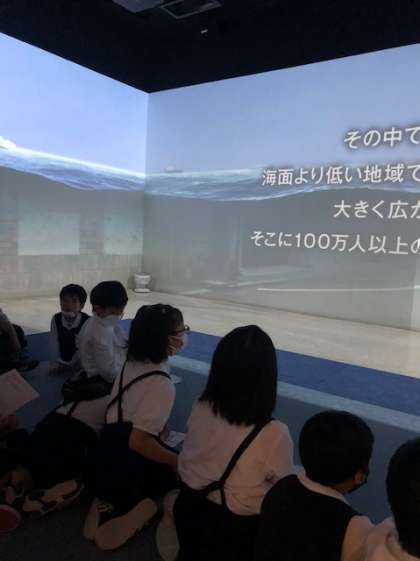 三方向が大きなスクリーンになっている部屋で、「南海トラフ地震」のシミュレーション画像を見ました。とてもリアルで、まるで実際に地震や津波が起きているかのようでした。