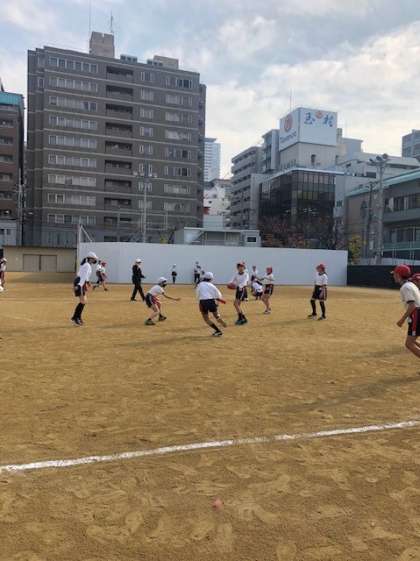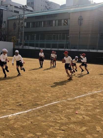 また体育の授業では、「タグラグビー」をしています。チームのみんなで声を掛け合ってしっかりと体を動かしています。