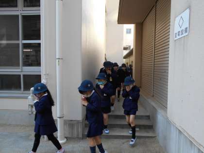 実際にこのような火事が起きた時、どうすれば最も安全に避難できるかを考え、東側の新校舎の中を通って外に出る学年、外側を回る学年、非常階段から外に出る学年に分け、避難することになりました。