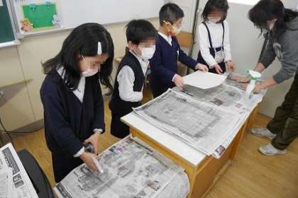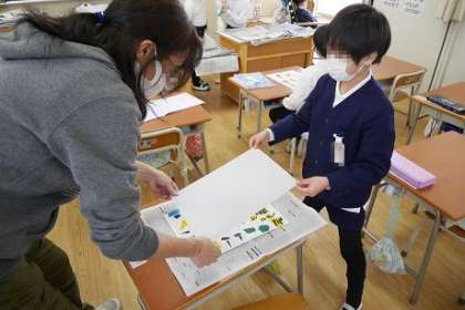 印刷の仕方を説明したあと実際に演示すると、とても興味が湧いたのか、子どもたちから「おぉ〜!!」と、歓声が響きました。印刷が終わった後に、感想を聞くと、「バレンでこするのがたいへんだった。」「たのしかった!」と、版画の印刷に満足そうでした。