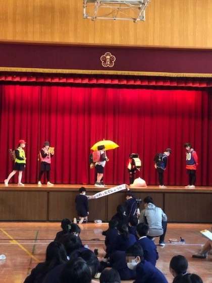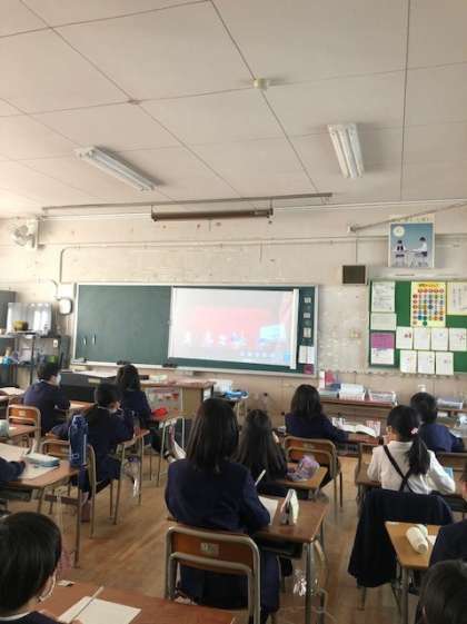講堂にはたくさんの児童が入れないので、教室にいる学年にはリモート配信し、集会に参加してもらいました。