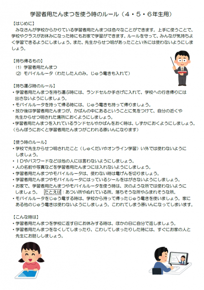 さて、1人1台学習者用端末の使用にあたっては、各家庭にお配りしている「学習者用端末等使用条件」や「学習者用端末を使うときのルール」を必ず確認してください。