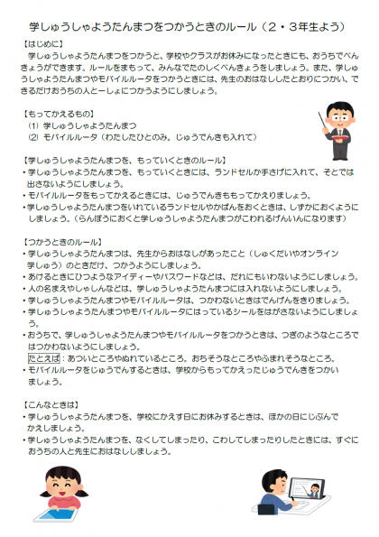 先日、1人1台学習者用端末をお配りし、家庭学習やオンライン学習に活用いただいていると思います。学校からの双方向通信の際も、ご協力ありがとうございます。