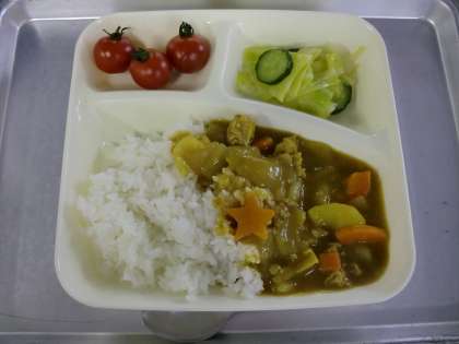 ★今日の給食(ポークカレーライス・グリーンサラダ・プチトマト・牛乳)