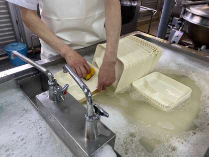・手洗いや食器洗浄機により、汚れを丁寧に落とします。洗った後は、食器乾燥機で乾燥させます。