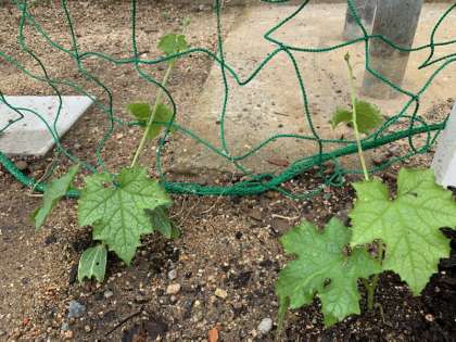 でも、ヘチマも頑張ってぐんぐん伸びているので、ネットに絡(から)まるようにつるを誘導(ゆうどう)してあげました。