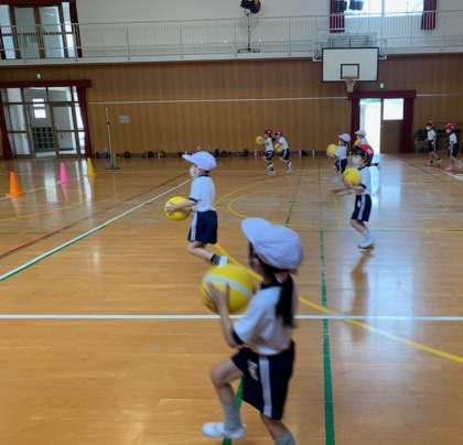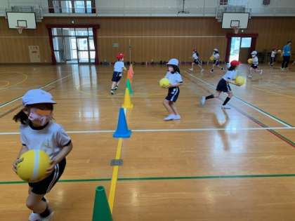 ボールを持って走ったり、片足でけんけんをしたりしてかけっこをしました。