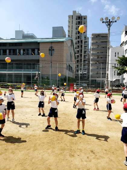 運動場でやったクラスでは、ミニハードルを使ったり、ボールを使ったりした学習をしました。