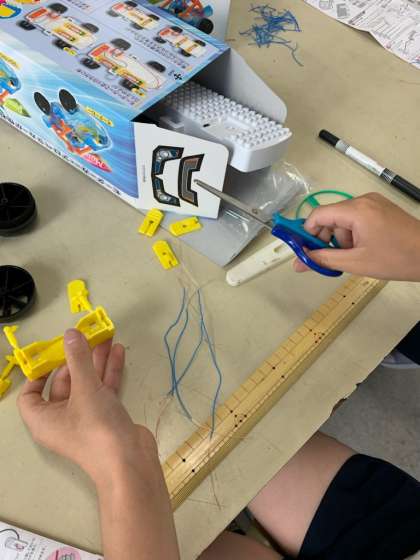導線を切ったり、部品を組み合わせたり、モーターの準備をしたり…。