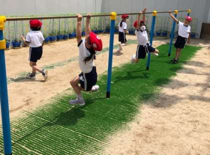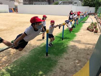 慣れてきた児童は、鉄棒にぶら下がりながら、
