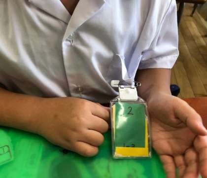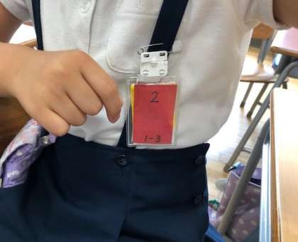 1年生にとっては初めての活動なので、自分の班・グループの色・どこの教室で活動するのかを明確にするために、名札の裏側にカードを入れました。