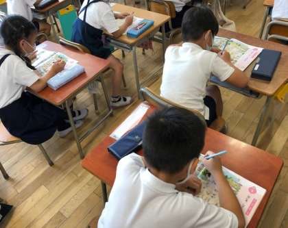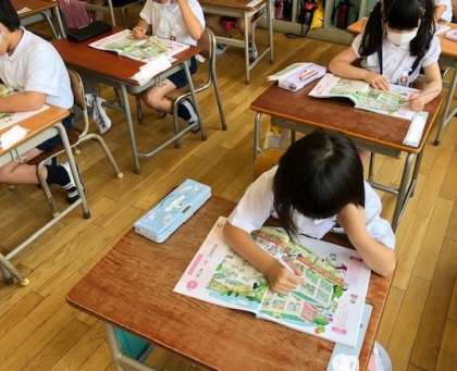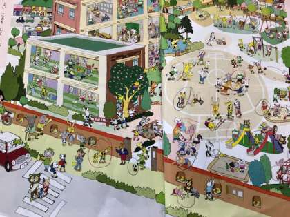 動物たちが過ごす小学校のイラストの中で、よくないことをしている動物、よいことをしている動物を見つけました。