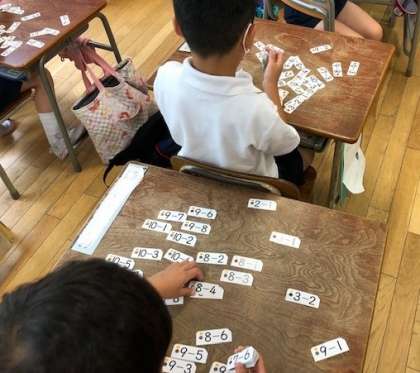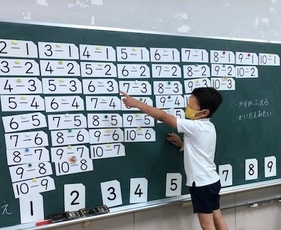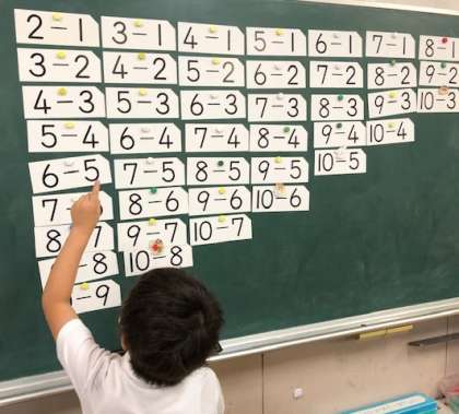 机の上にひき算の計算カードを並べ、並び方の決まりを見つけました。