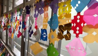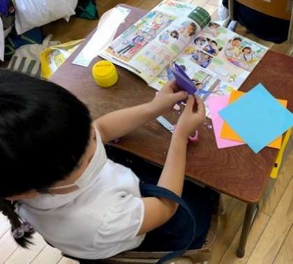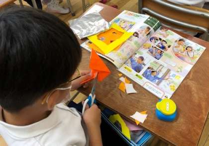 はさみで切った折り紙を、2〜4枚縦に繋げました。