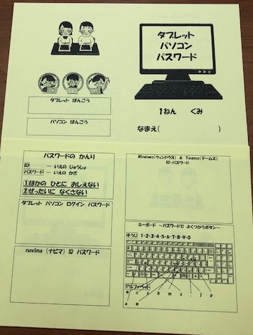 それに先立ち、「タブレット端末」のログインパスワード、「Teams」のIDやパスワード、「デジタルドリル」のIDやパスワードなど、それぞれ違うアルファベットや数字が与えられているので、1つの紙にまとめて貼りました。