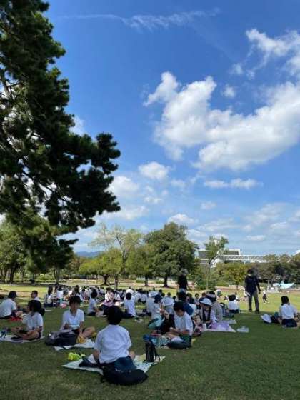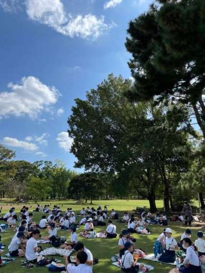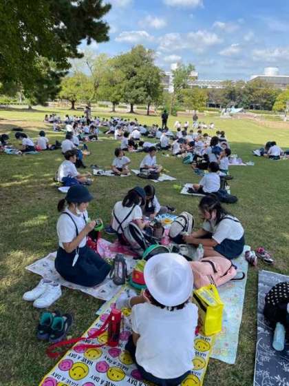 青空の下でみんなと食べるのお弁当はとっても美味しいです!
