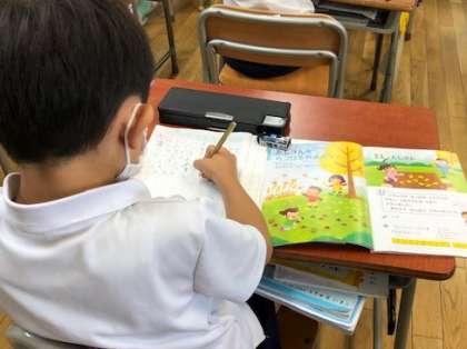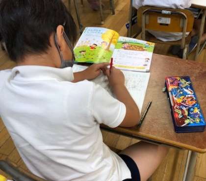 教科書の絵を見て、たし算の問題作りに取り組みました。