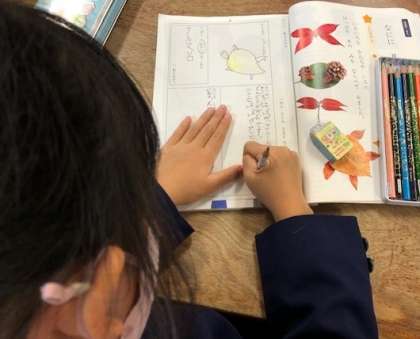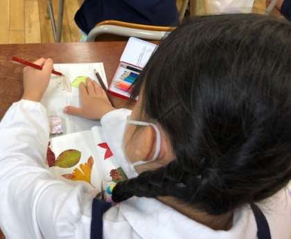 教科書に載っている葉っぱや木の実が組み合わさったものが何に見えるのかを考えました。