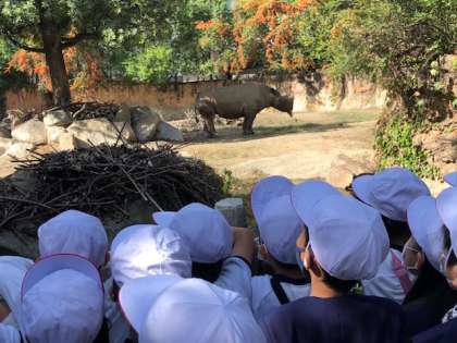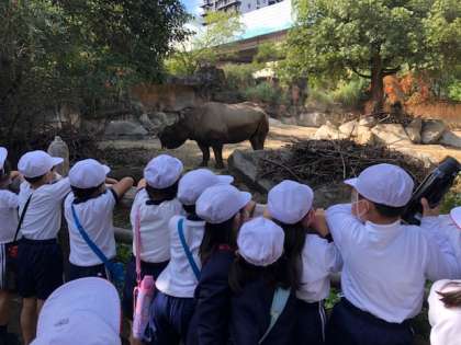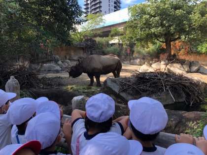 「サイも大きい!」「カバに似てる〜」「あ、草食べてる、見て!」
