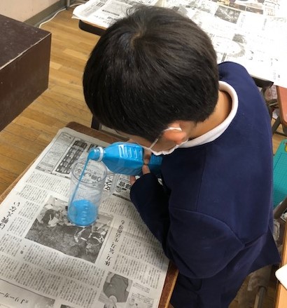 用意したペットボトルの水を、いろいろな容器に移し替え、水の高さがどう見えるかを学習しました。