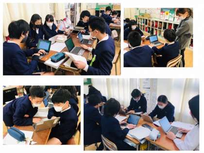 写真は、学習者用端末を使い、発表資料を協同して作成しているところです。