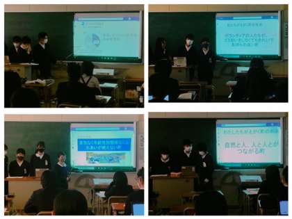 さらに、国語の「町の幸福論」の学習から学んだことをもとに、これからの未来の南大江の町について自分たちの提案を発表する学習を行なっています。