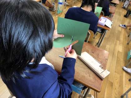 1年生の児童が図画工作科の時間を使って、ツリーの葉っぱをやサンタクロースの飾りを作りました。