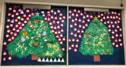12月にはクリスマスがあるので、小学校の玄関に掲示板が「クリスマスツリー」になりました。