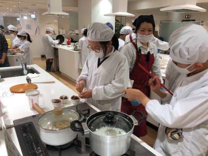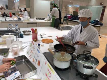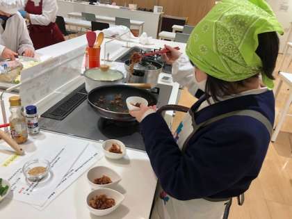 今日のテーマは「エコクッキング」です。おみそ汁の出汁を取ったかつお節は、フライパンで甘辛く炒めて、ゴマをかけていただきます!