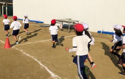 運動場に出て、かけ足に取り組みました。